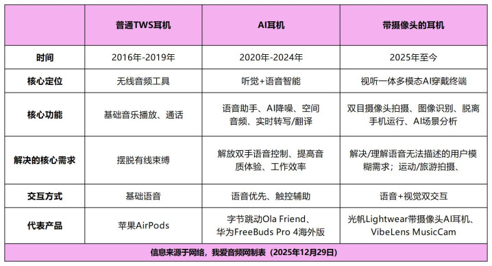 TWS耳机演进的这十年,约莫别离为泛泛TWS耳机、AI耳机、带录像头耳机。