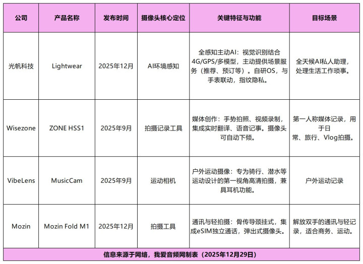 在这之中有三家中国公司,光帆科技、深圳睿宝智能(VibeLens)、牧之音科技(Mozin)较国际大厂率先处置带录像头的耳机,展现了中国企业从看法跟进到产物落地的快速。这些公司发布的带录像头的耳机,在录像头中枢定位、功能、主张场景上有所互异。