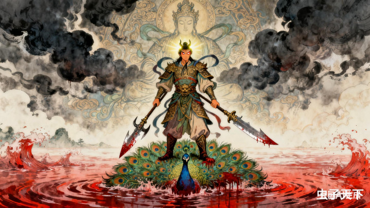 梦里,一个三只眼的男东谈主站在渭水中央,眼下踩着一条血淋淋的孔雀脊梁。